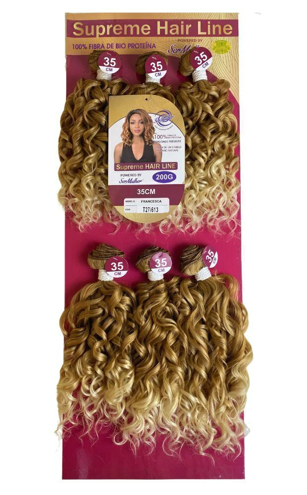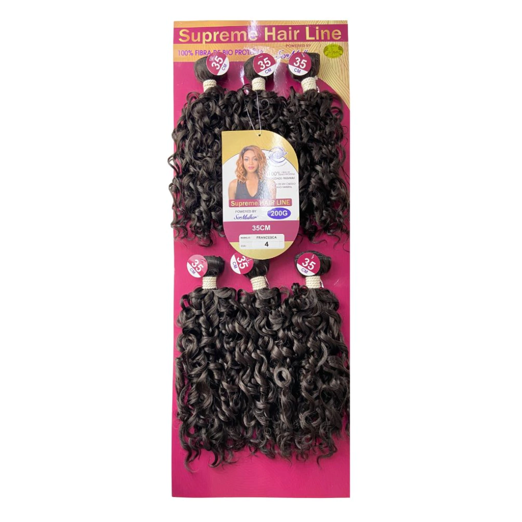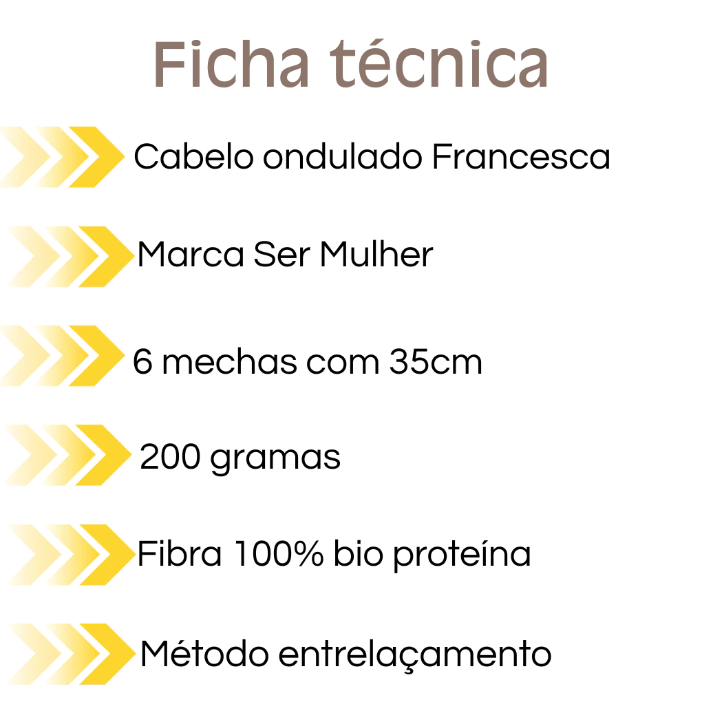 O Cabelo Bio Proteína Francesca Ondulado oferece uma textura suave e natural, com aparência semelhante ao cabelo humano. Cada pacote contém 200 gramas de fios distribuídos em 6 tufinhos mechas com 35 centímetros, garantindo versatilidade no estilo e volume desejado. A fibra apresenta uma aderência excepcional ao creme e possui uma textura super sedosa, com um acabamento natural que se adapta perfeitamente a diferentes tipos de cabelo.