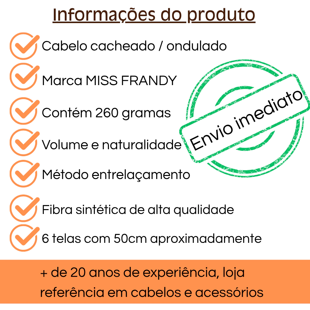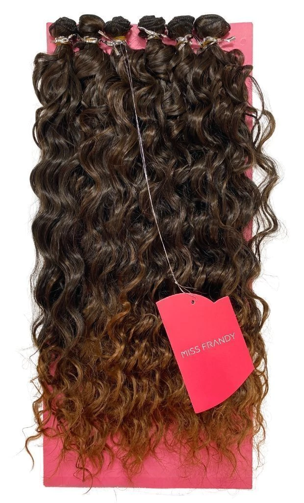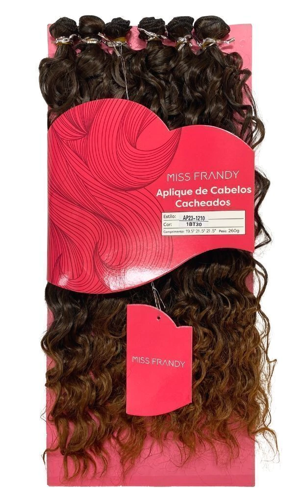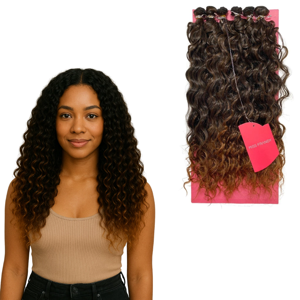 O cabelo sintético Miss Frandy é feito de fibras sintéticas de alta qualidade que imitam o cabelo humano de forma realista, com um padrão de cachos durável e definido. Possui facilidade de manutenção e capacidade de manter sua forma por períodos prolongados, mesmo após várias lavagens.